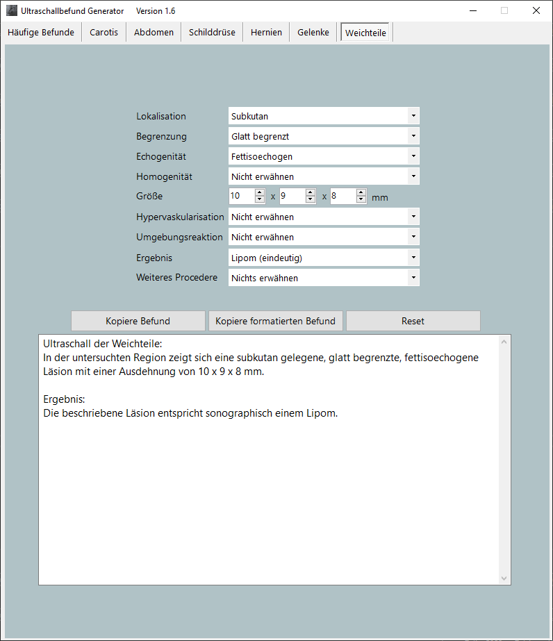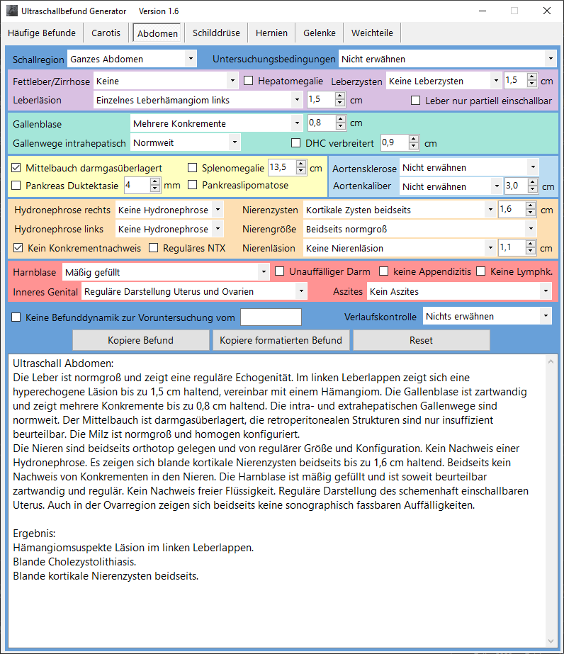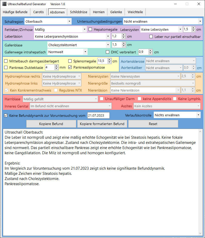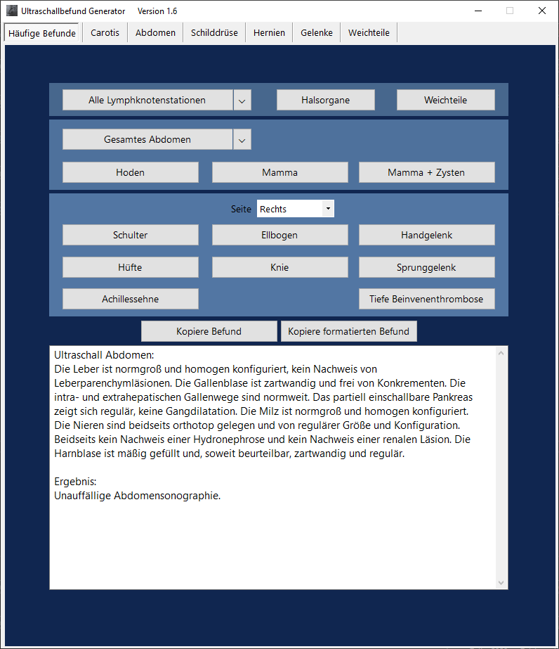 Der Ultraschallbefund Generator ist eine dynamische Software, um Ärzte und Sonographer bei der Befundung von häufigen und sich wiederholenden Ultraschallbefunden zu unterstützen. Sie ermöglicht eine effiziente und strukturierte Befundung. So kann beispielsweise der klassische „Steatosis hepatis + Zustand nach Cholezystektomie“ Abdomen Ultraschallbefund mittels weniger Klicks in Sekundenschnelle umgesetzt werden.